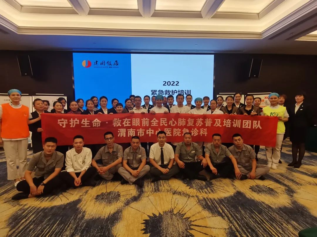 为普及急救知识,提高服务行业人员应对突发事件和意外伤害的自救与互救能力,及时、科学、有效处置意外伤害,7月26日下午,乐鱼在线登录入口急诊科一行7人以“守护生命 救在眼前”为主题的心肺复苏科普培训走进渭南市建国饭店,为40多名酒店工作人员开展急救知识培训。