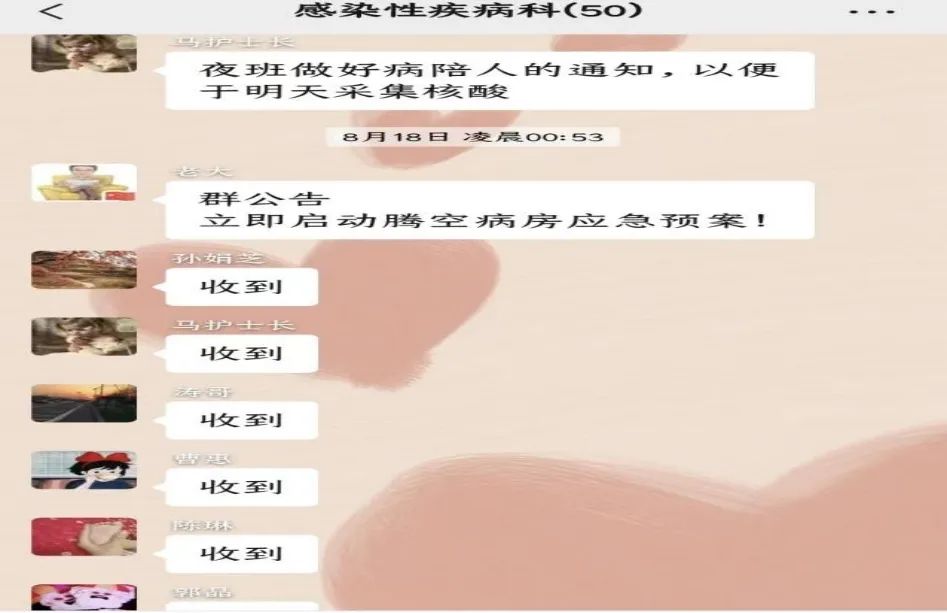 我的思绪又回到了本轮疫情刚开始的时候,8月18日晚上,就在我记完笔记准备睡觉的时候,科室群消息响了,我心想,这大半夜的怎么了?一看微信,李主任通知大家立即启动腾空病房应急预案。凌晨00:53分,大家积极响应,立即参与战斗,这就是我们渭医感染人的力量,这就是我们渭医人的速度和担当。