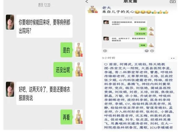 一天,朋友圈里一个动态吸引了我的眼球。李红兵主任分享了一则“来自儿子的关心”的动态。对话很简短,语言很朴实,但是儿子对父亲的关爱之意溢于字里行间,孩子期盼爸爸回家的心情露于屏幕之外。我在想,主任的朋友圈平时除了工作貌似没看见过别的。仔细一看,这则对话发生于凌晨12:20分。同样身为父母,我能体会到孩子关心关爱于父母而言的那种感动,那种“孩子终于长大懂事”的欣慰,那种有爱交流的畅快感。我估计孩子这番爱的表达在这样一个时候肯定让主任心里暖流涌现。这时候我才知道,李主任在这次疫情中和同志们一样闭环隔离在老院区抗疫。