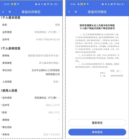 进入信息填写页面后确认本人及使用者信息,包括证件号、姓名、参保地、单位名称(居民直接填写社区信息)、手机号、开始日期、结束日期、顺位支出等。绑定信息填写完成后,选择“查看个人承诺书并完成签名”,进入电子承诺书界面,阅读承诺书信息后,点击“签名”按钮完成电子签名,点击“保存签名”后提交绑定信息。