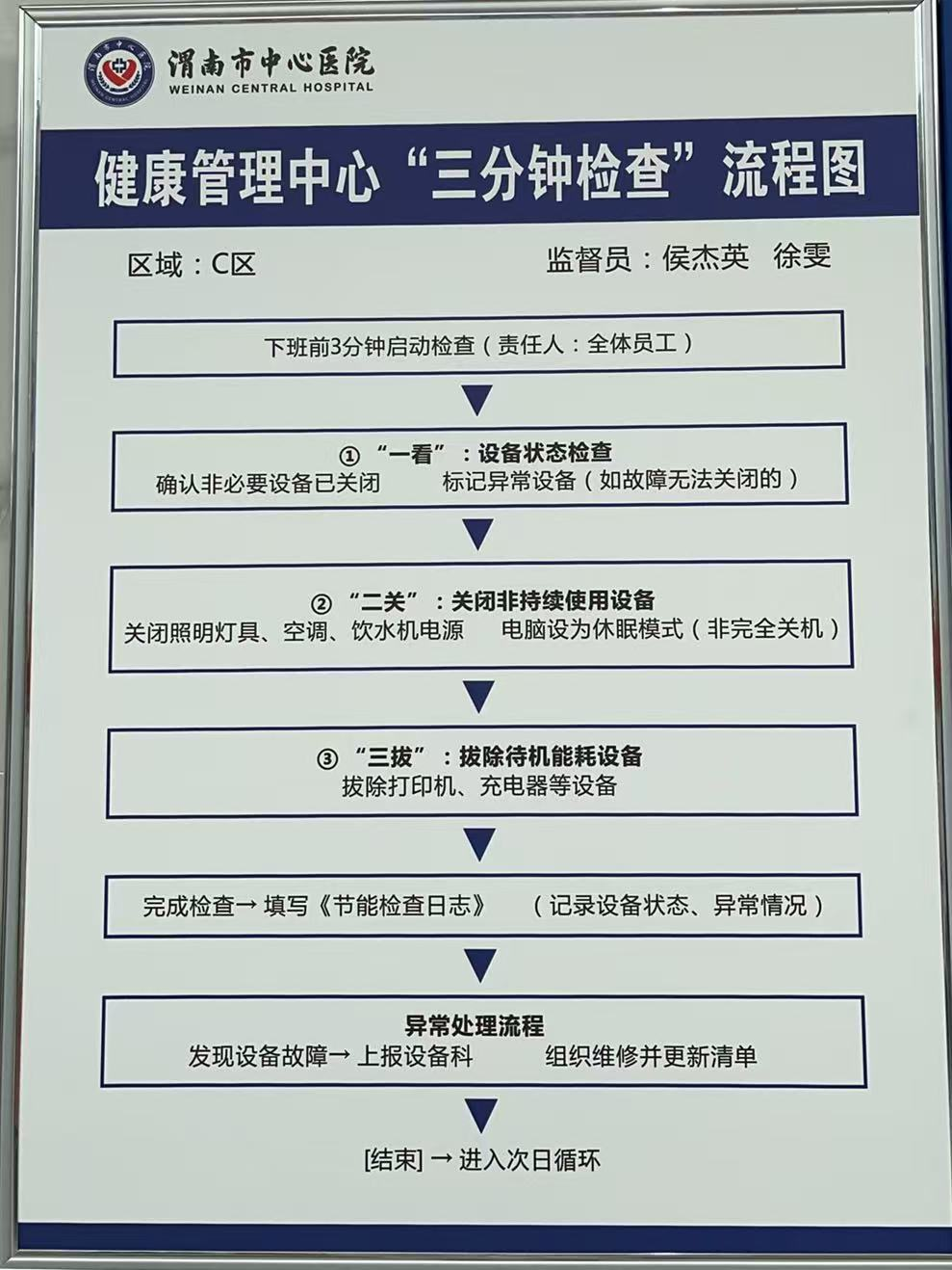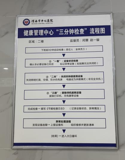 此次行动中,健康管理中心全员参与,划分4个责任区域,分别张贴“三分钟检查”流程图,每个区域指定2名节能监督员,负责每日检查与反馈。通过“个人自查→区域监督员巡查→护士长抽查”三级联查机制,形成闭环管理,以“三分钟”的行动自觉汇聚绿色发展动能。