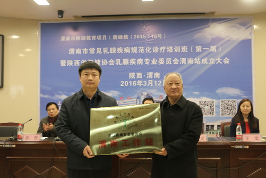 图为耿庆义为陕西省保健协会乳腺疾病专业委员会渭南站授牌