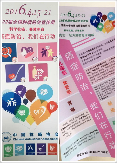 4月15日—21日,第22届肿瘤防治宣传周活动在全国范围内展开。我院肿瘤胸外科在杨斌主任及王爱萍护士长的倡导下,于4月20日下午14时,围绕“科学抗癌、关爱生命、癌症防治、我们在行动”主题开展了宣传活动, 30余名病陪人参加了本次活动。