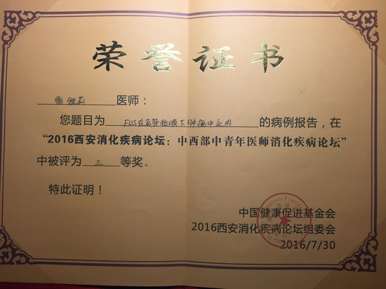 雷雅莉副主任医师作为渭南地区唯一的青年医师,出席本次会议病例讨论。在全国超声内镜大会上,成功讲解了我院超声内镜在食管粘膜下肿瘤诊断及治疗方面的进展,推动了我院超声内镜技术的发展,讲课后受到国家级教授的一致好评。同时,雷雅莉医师荣获“2016西安消化疾病论坛:中西部中青年医师消化疾病论坛”三等奖,受到大会表彰。