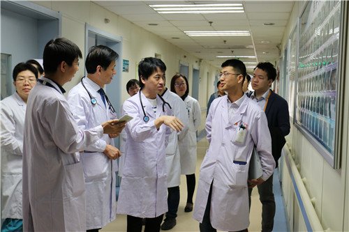 早上10时许,下地显一郎教授在心内科李军农主任医师、侯江红副主任医师的陪同下,参观了我院心血管内科门诊,了解门诊日均接诊量情况。随后对心内科病区进行了参观,对心内科的远程监护系统非常感兴趣,咨询了相关问题,并和李军农主任医师在远程监护平台前合影留念。整个交流过程由心内科主治医师齐浩明全程进行英语翻译交流。