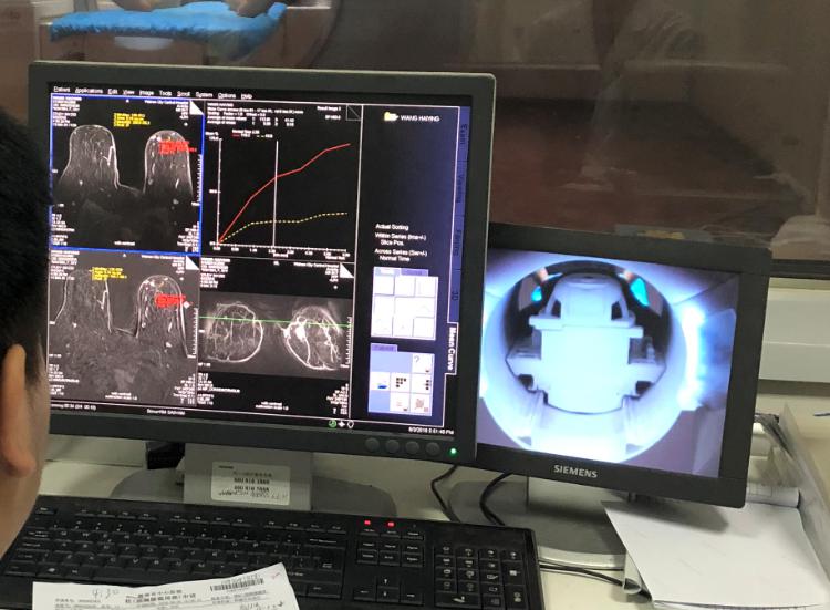 近期,CT&MR影像诊断科成立了规范化的乳腺MR检查、诊断小组,并顺利完成多例MR乳腺检查及准确诊断。其中一例“特殊”的患者,体重约120kg,由于其行动极为不便,常规体位无法长时间保持,可能导致检查效果偏差,影响诊断结果。面对这样的困难,刘康副主任带领科室团队,利用在上海所学习到的先进技术经验,经过反复的调试及改变扫描体位和序列的方法,在满足患者受检舒适度的前提下,获得了优质乳腺诊断图像,做出了精确的影像诊断,并得到了临床的高度认可和一致好评。