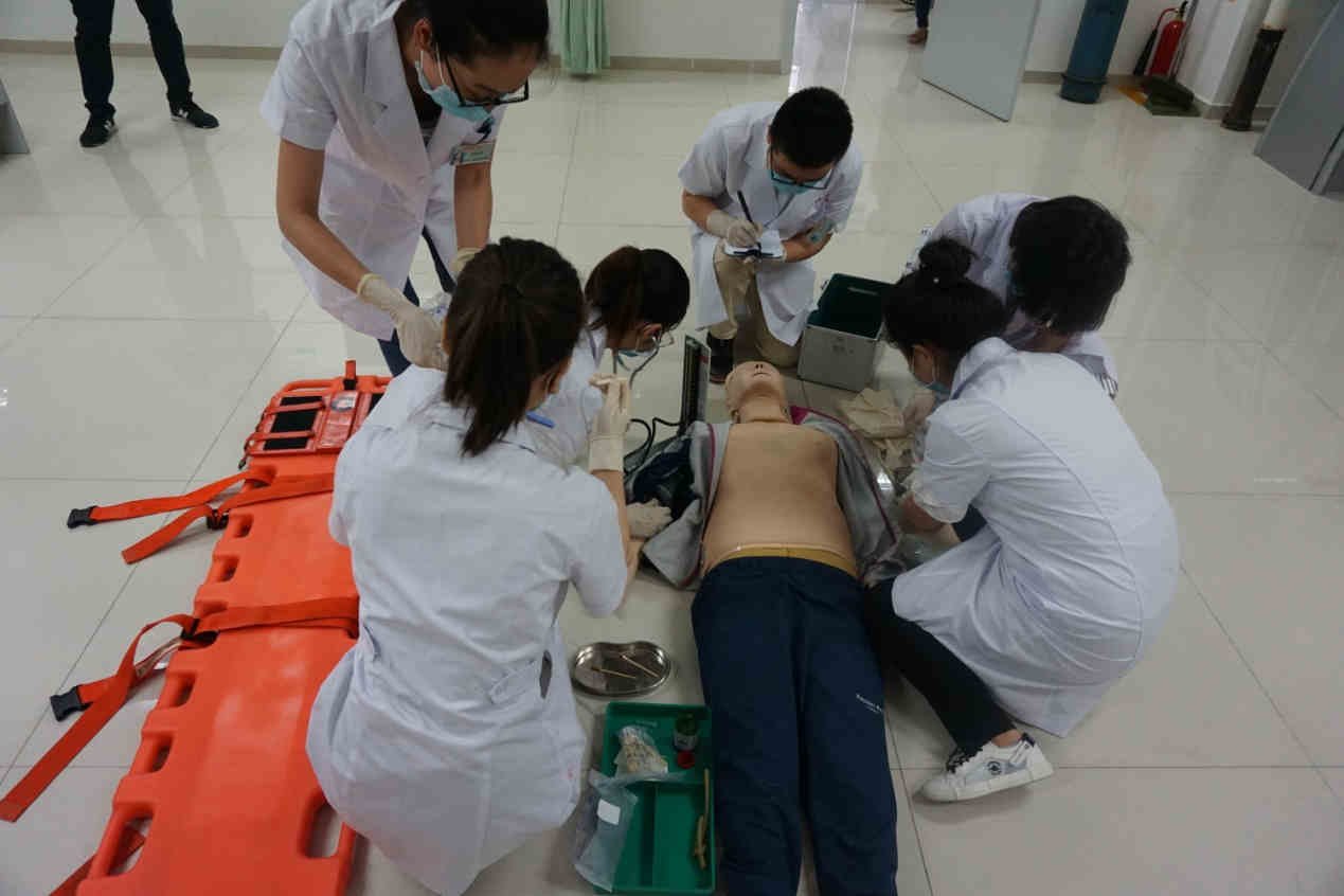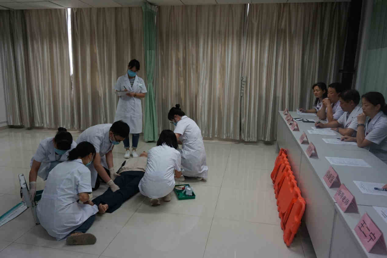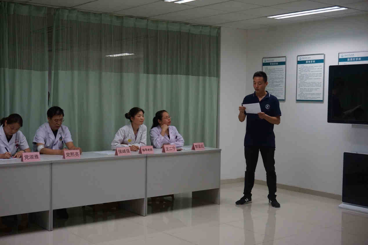 7月31日,乐鱼在线登录入口科研教学科在实践技能训练中心举行了2017级全科住培学员院前急救演练活动。科研教学科主任周东升、急诊急救中心主任王永升、全科医学科主任刘红、党淑雅担任考官。骨二科副主任党熙亮副主任医师、普外科侯峰强副主任医师、急诊科师资郭亚红、王二宁主治医师作为学员院前急救培训指导老师参加了演练活动。演练由科研教学科干事何博武主持。