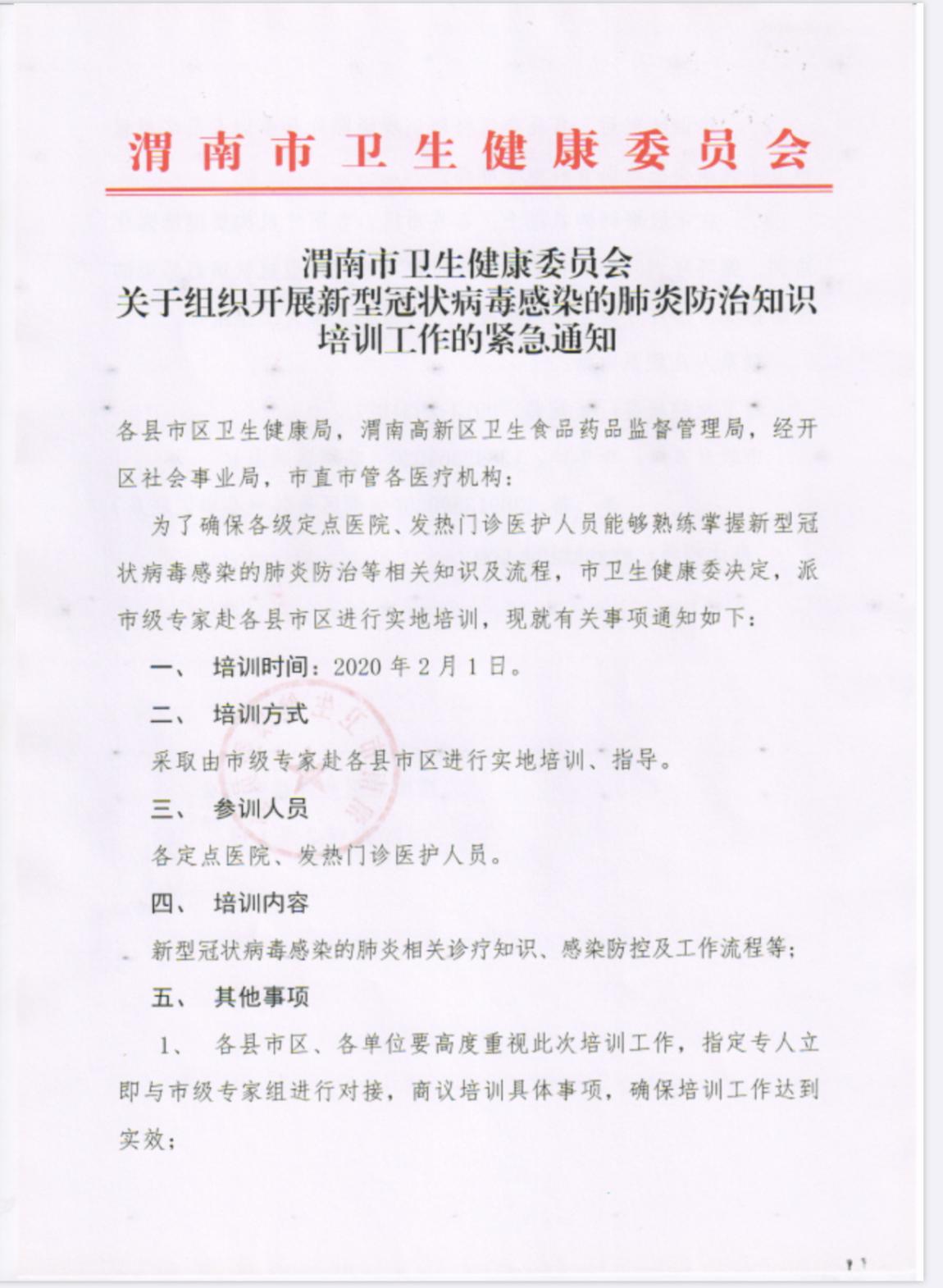2月1日中午,乐鱼在线登录入口接到渭南市卫健委关于选派市级专家赴各县对全市各级定点、发热门诊医护人员能够熟练掌握新型冠状病毒感染的肺炎防治等相关知识进行实地培训的紧急通知,乐鱼在线登录入口收到通知后,医院防控工作领导小组迅速安排人员,排除一切困难,协调人员,抽调下夜班的重症医学科李冬纯主任医师、李媛媛主治医师,呼吸内科康军英副主任医师及感染性疾病科孟雪飞副主任医师四位专家在保证医疗安全的前提下奔赴全市各个区县进行培训。