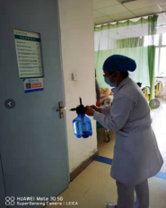 科室人员时刻牵挂着疫情进展、关注医院工作,护士长在下班的途中遇见送水壶的快递小哥,果断将店里的44个喷水壶全部购买,提供给了总务科;党员护士郭婉将给儿子备用的非接触红外线电子体温计提供给科室,供陪人体温筛查时使用;护工李阿姨将自己家中的电动喷雾器清洁处理后带到科室,环境消毒时使用。