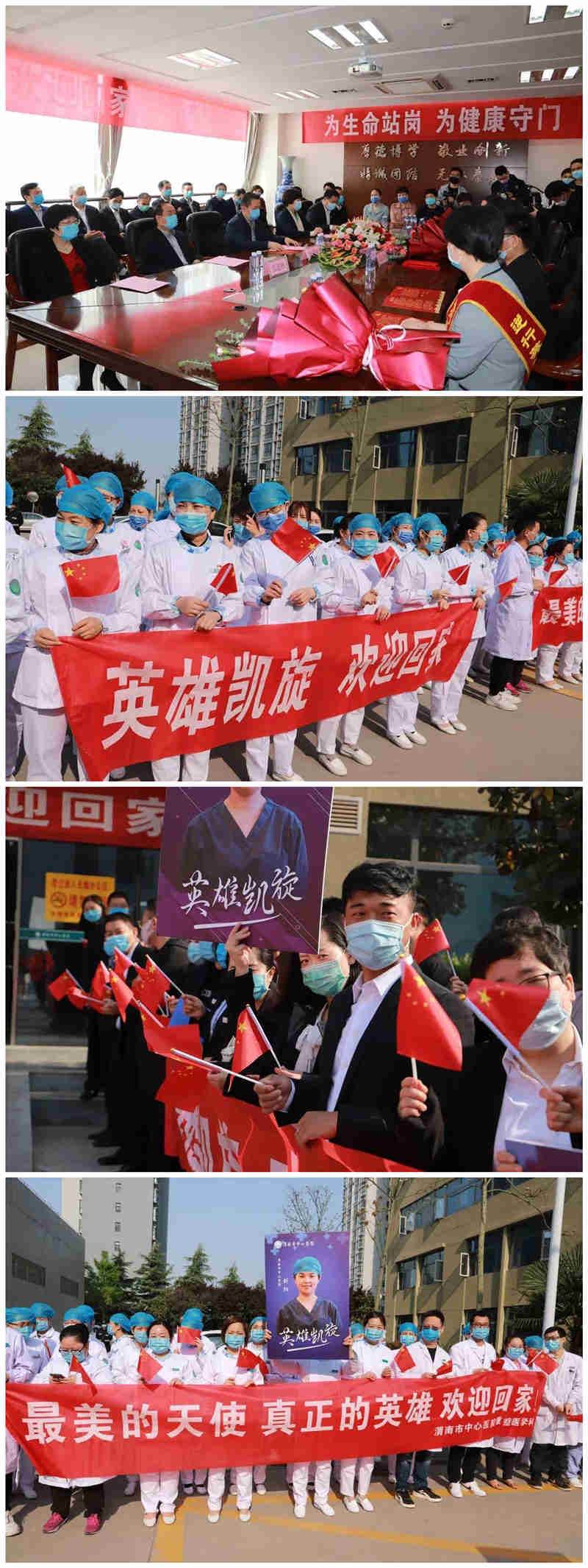 最美的鲜花送给最可爱的人,上午9时30分,医院领导、职工、医疗队员家属等,近百人戴着口罩,手持小国旗,齐聚医院行政楼下,等待着英雄们归来。