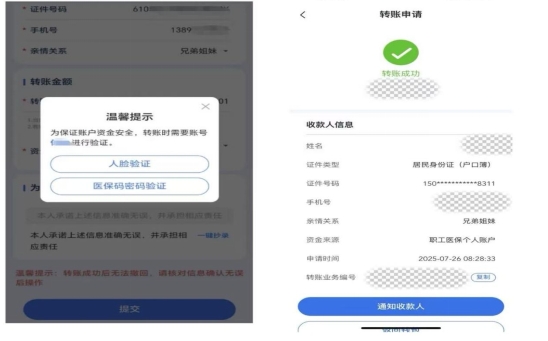 1.点击医保钱包转账申请—完善转账信息(红色*为必填项)—进行支付验证(两种方式:人脸验证和医保码密码验证皆可)—转账成功。