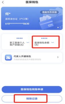 2.转账成功后,共济亲属接收人打开国家医保服务平台APP—点击医保钱包—查看钱包余额,如需查询转入或转出记录可点击医保钱包转账记录功能查看往来记录。(划重点:个人账户和本人医保钱包之间不能互相转账。)