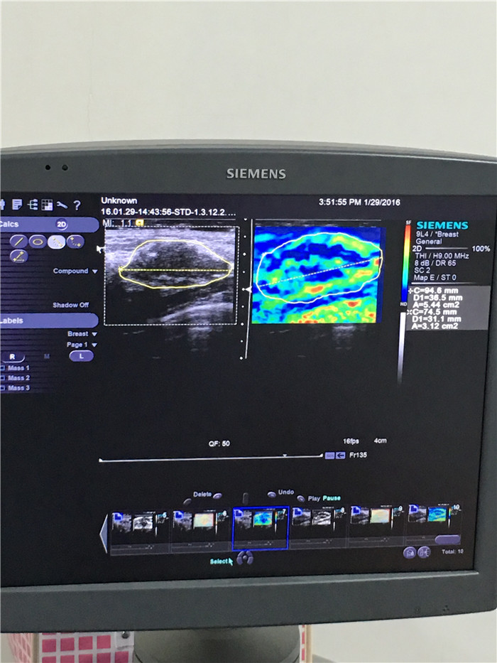 为进一步提高乳腺检查的敏感性和诊断的准确性,我院功能科在全市率先引进弹性成像这一辅助新技术,为早期诊断、鉴别乳腺肿瘤的良、恶性及早期治疗提供的一种新的有效途径。 作为一种全新的成像技术,弹性成像扩展了超声诊断理论的内涵和超声诊断范围,弥补了常规超声的不足,能更生动的显示、定位病变及鉴别病变性质,使现代超声技术更为完善。实时组织弹性成像不仅能帮助早期发现不易触及的微小及深在的病灶,在识别传统灰阶声像图上难以发现的病变浸润区域上也有优势,还能鉴别一些临床上较难诊断的乳腺病灶,如不典型的乳腺病及炎性病变。并且,如果弹性成像图与灰阶声像图上肿瘤的大小比较确可作为一种可靠的检测指标,那么临床早期发现恶性乳腺癌的比率将大大提高,需要接受活检以确定良恶性的患者数也将大大减少,既可帮助减轻社会医疗保健的经济负担,也可减轻患者自身身体和心理上的痛苦。其在临床上的应用包括:1.癌症的早期诊断;2.病变的良性、恶性判断;3.癌变扩散区域的确定;4.治疗效果的确认。