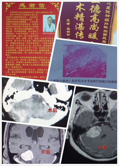 患者张某,女,67岁,大荔人,于4月13日入院神经外科二病区。患者自诉头晕2月,加重1周,行颅脑CT及MR提示:右侧桥小脑角区肿瘤,考虑脑膜瘤或听神经瘤可能。入院后白西民主任医师高度重视,积极进行术前准备及讨论,反复与患者家属沟通,家属要求在我院手术治疗。由白西民主任医师主刀,杜春亮主治医师、赵云洁住院医师配合下于4月21日在全麻下行右侧桥小脑角区肿瘤切除术,经过7小时32分钟努力,成功切除肿瘤。病理报告提示:淋巴细胞性脑膜瘤。