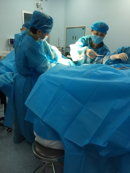 麻醉手术科护士快速消毒,做好术前各项准备,麻醉医师紧急实施麻醉,在大家的配合下,魏主任为患者实施剖宫产术,患者进入手术室后不久,一声清澈而响亮的婴儿啼哭声响遍手术室。不久,另一个婴儿也顺利出生,母子平安,全体医护人员终于松了一口气。整个过程为了避免脐带再次脱出及受压,医生孙妮一直蹲在手术台旁,手上推着胎儿,蹲在手术床边,直到胎儿被平安救出,才把手从产妇的阴道内撤出来,手术完时她已经腿麻得站不起来了。