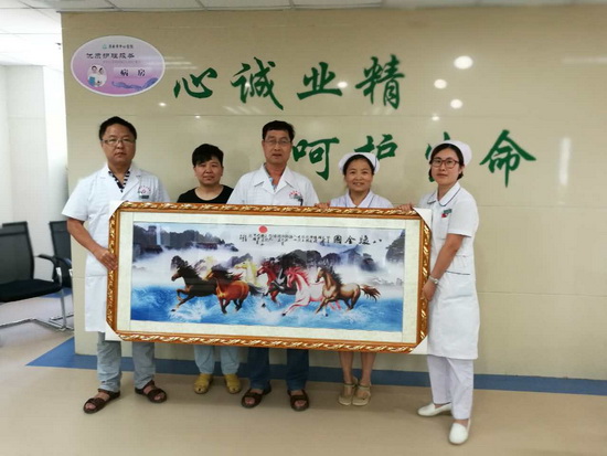 太感谢你们了!谢谢!谢谢!一位姓梁的女士向中医科医护人员连声道谢,并赠送自制十字绣“万马奔腾”表示感谢,患者本人用他已经恢复的右手亲自书写了感谢信!