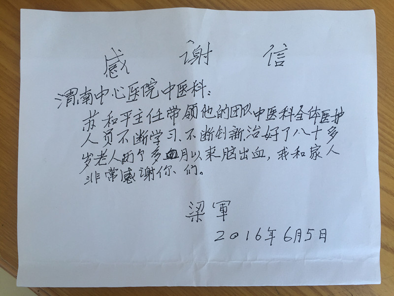 据悉,5月初,一位83岁退休领导干部因脑出血在西安交大附属一院住院治疗,病情稳定后转至乐鱼在线登录入口中医科继续康复,据梁女士(患者女儿)介绍:父亲得了脑出血之后,因病情比较复杂,在西安交大附属一院住院20余天,病情基本平稳,为进一步康复治疗,经120转院来到咱们中医科,主治医师杨浩锋介绍:刚入院时患者意识模糊,左侧肢体活动不灵,带有尿管,同时感染了大肠埃细菌特殊感染。接诊后,中医科苏和平主任、杨浩峰主治医师等,考虑患者年龄大,病情复杂,制定了严密的治疗计划。苏主任指出,脑出血急性期过后,要尽早使用活血化瘀的药物(这在一些西医科室,针对此类病人应用活血化瘀的药物是非常慎重的),在充分评估病人后,入院第三天就使用血栓通(药物的主要成分为三七活血化瘀治疗),用药一周病人症状就明显改善,意识清楚,尿管拔除。继续经过一月多月系统治疗,复查C T,血肿完全吸的收,患者康复出院。梁女士说,父亲现在可以自行洗漱、行走、上卫生间、读书、看报,生活完全自理,跟正常人一样,就是行动慢一点,甚至相比它住院之前脑子更清晰,这得谢谢中医科的医护人员,没有你们专业的医疗团队和精心细致的护理,就没有现在行动自如的父亲。