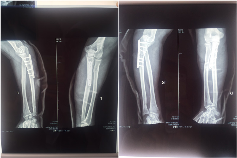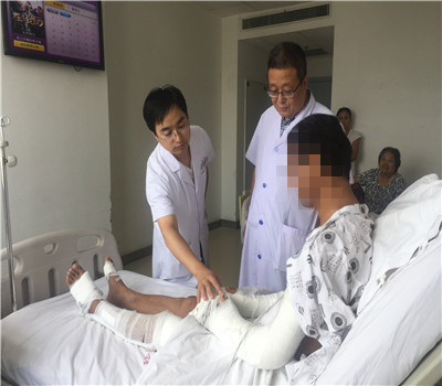 由于患者伤势严重、出血较多,家属非常着急,手术需立即进行。程福宏及郭张宏两位医师对此患者非常重视,迅速制定治疗方案,第一时间报告科室翁润民主任丶雷广宇副主任。患者由于出血多、多处骨折合并肌腱、肌肉、神经损伤需要立即手术修复。经过配血等术前准备,在麻醉手术科的协同下,历时7个小时手术,患者骨折得到复位固定,神经、肌腱等损伤得到修复,手术成功。经过骨一科医护人员20多天的精心治疗和护理,患者目前已进入后期康复阶段。患者及家属对骨一科医护人员精心治疗及护理非常满意,再三表示致谢。
