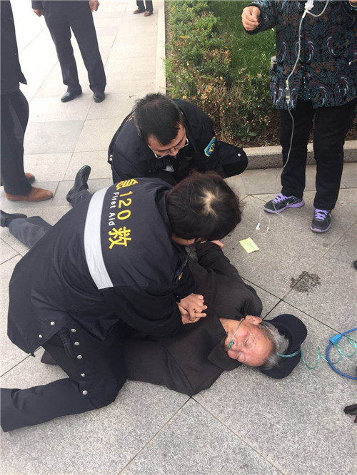 由于老人在广场中间晕倒,救护车无法直接开到现场,三名救护人员便带着急救器材飞奔到患者身边,发现躺地的患者面色青紫、嘴唇发绀、嘴角处有呕吐残留物。