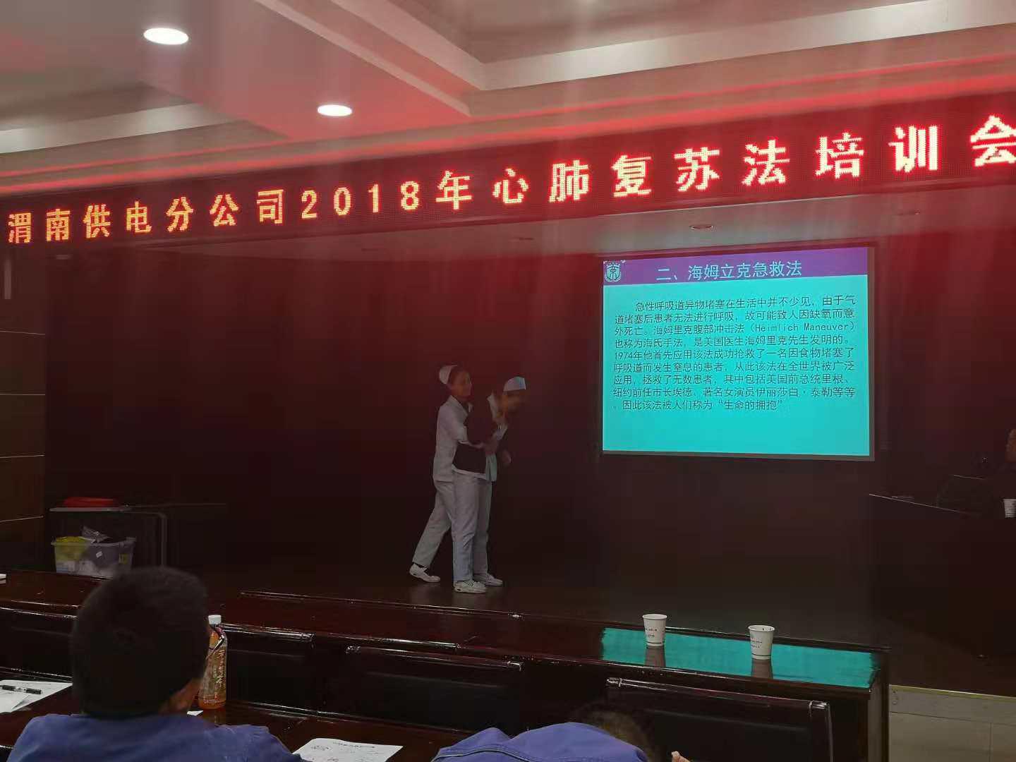 为了不断提高电力从业人员心肺复苏操作水平,加强员工应急救治能力,10月11-12日,乐鱼在线登录入口急诊科副主任范华杰、张娟红护士长携3名护理骨干走进渭南市供电公司,再次开展了心肺复苏培训普及活动。