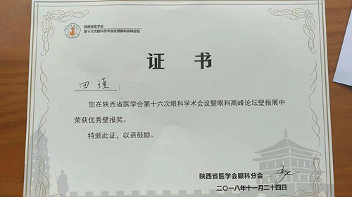 11月17日,第三届西部眼科联盟暨陕西省屈光白内障高峰论坛在西安盛大召开,乐鱼在线登录入口眼科副主任田瑾,带领翟阿萍、马钰等参加了此次论坛,由我院推送的《“不一样的汉堡”——晶状体溶解性青光眼一例》手术作品获得优秀荣誉证书及奖杯。同时,这一手术作品被陕西省眼科年会会务组录用为陕西省眼科年会电子壁报,获得“陕西省医学会第十六次眼科学术会议暨眼科高峰论坛”优秀壁报奖。