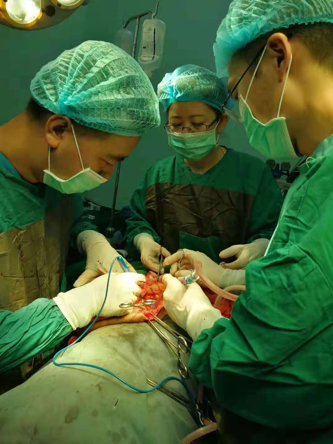 11月26日,中国第34批援苏丹医疗队医生朱毅东(乐鱼在线登录入口普外科)、王向锋(乐鱼在线登录入口耳鼻咽喉头颈外科)为一名苏丹患者施行了一例右侧乳腺巨大肿瘤切除术。病人系当地女性居民,自述发现乳腺肿块近2年,由于经济条件医疗条件有限,未行任何治疗,近期以乳腺恶性肿瘤收入院,发现肿瘤巨大,约10cm大小,手术难度较大,面对苏丹极差的医疗条件,朱医生没有放弃,没有助手,叫来王向锋医生、同队护士帮忙。手术时,由于肿瘤巨大,且是恶性肿瘤,必须进行右乳全切+淋巴结清扫,肿瘤边缘必须耐心细致剥离,由于是关键部位,剥离多了,对患者健康及伤口恢复不利;少了,术后效果不佳 ,所以施术者必须经验丰富,每一步必须耐心、细心,才能保证手术顺利达到治愈效果。他们以自己丰富的经验和娴熟的手法进行手术:剥离、止血、结扎、继续分离.....不知不觉2小时20分过去了,手术顺利完成。