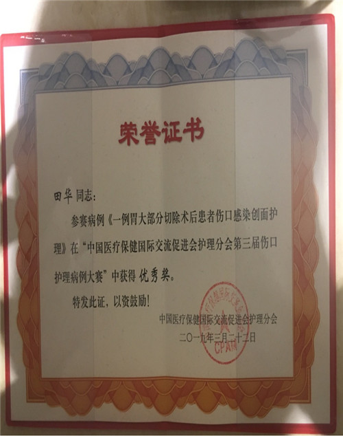 从全国各大医院报送的几百份病例中入围230份进行初选,其中精选出60份病例参加复赛,普通外科田华报送的“一例胃大部分切除术后患者伤口感染创面护理”在本次大赛决赛中获“优秀奖”,护士长张少青及护师田华参加了本次大赛。