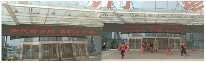 宣传“第五届营养周口号及主题”:门诊楼外游飞字幕24小时滚动播放。