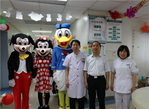 5月31日上午,在六一儿童节来临之际,乐鱼在线登录入口儿科病区悬挂着“医者仁心 呵护幼苗 欢度六一”横幅,病房两侧粘贴着五彩缤纷的气球和卡通图画,卡通人物唐老鸭、米奇和米妮在病房和孩子们娱乐互动,儿科病房充满着孩子们的欢声笑语,近百名“小病号”在医护人员的陪伴下迎来了一个快乐的儿童节。