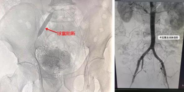 李建国主任当即立断开通绿色通道!何彤副主任、白小爱护士长及科内应急人员第一时间集结到位。在手术室医护人员的密切监护下将患者直接从手术室带全麻呼吸机转运到介入科,争分夺秒进行救治。术中给予开通三路静脉通路,加压输血输液、全麻加压吸氧…李建国主任、何彤副主任、谢纱医师密切配合精准操作,行左侧股动脉穿刺双侧髂内动脉造影,明确出血动脉后行介入右侧髂动脉球囊阻断下取除填塞二次剖腹探查膀胱尿道修补止血术。在介入科、泌尿外科、普外科、骨科、麻醉手术科的医护人员密切配合下,各项急救措施有序得力。多学科联合行盆腔探查术、膀胱破裂修补术、尿道断裂吻合术+乙状结肠浆膜层破裂修补术,手术顺利完成。再次行腹主动脉、盆腔动脉造影无明显出血部位,患者生命体征稳定,转入重症医学科进一步支持治疗。
