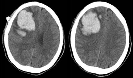 入院后,在白西民主任、姚胜副主任组织下,党俊涛主任医师及冯毅副主任医师协作,由杜春亮主治医师、王小峰医师及王举医师实施手术。避开重要的血管和神经,取右额平行于中线纵形切口长约4cm,骨窗直径2.5cm,经额叶顺穿刺将套筒准确置入患者大脑深部的血肿腔,建立供内镜通过的微小孔道,再置入圆珠笔芯粗细内镜,以提供良好的照明和视野,很快就准确彻底地清除了深藏脑内的淤血。术后CT显示血肿清除干净,目前患者神志清楚,已康复出院。