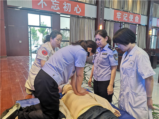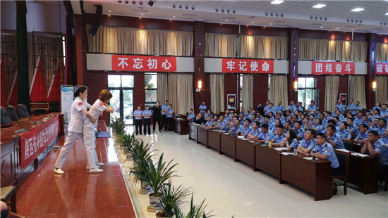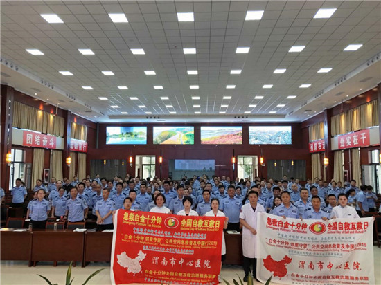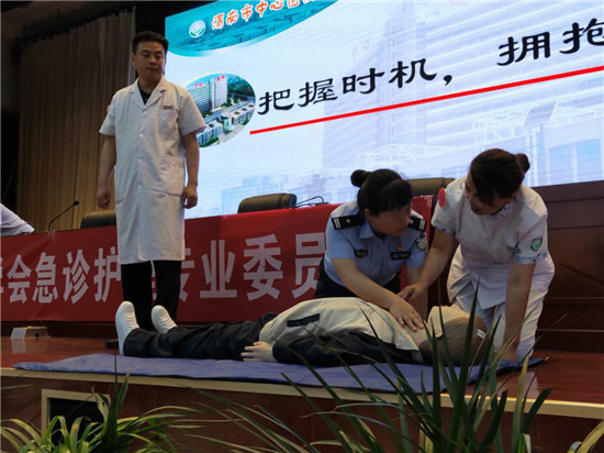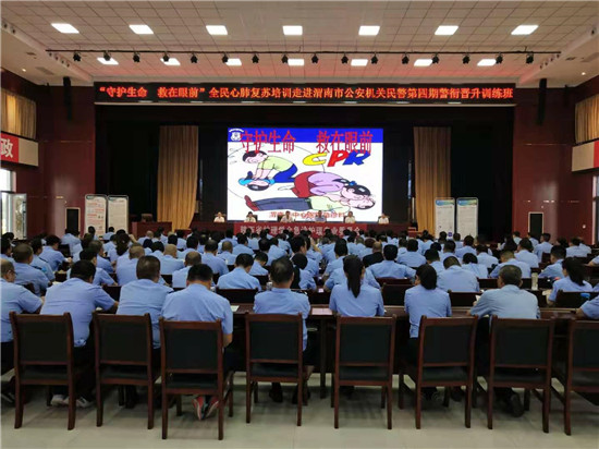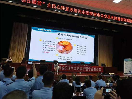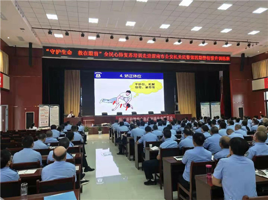7月17日,在“急救白金十分钟”联盟的助力下,为提高一线公安机关民警应对突发伤害事件及现场急救的能力,乐鱼在线登录入口急诊科一行8人急诊急救团队以“守护生命 救在眼前”为主题,走进渭南市公安机关民警第四期警衔晋升训练班。活动旨在普及全民“徒手心肺复苏术”、“海姆立克急救法”等急救知识,提高一线公安机关民警急救意识,提倡人人自救互救。本次培训活动由陕西省护理学会急诊护理专业委员会主办,由乐鱼在线登录入口急诊科、渭南市公安局政治部警训处协办,活动在渭南市合阳县党校举行。乐鱼在线登录入口急诊科副主任范华杰主持。