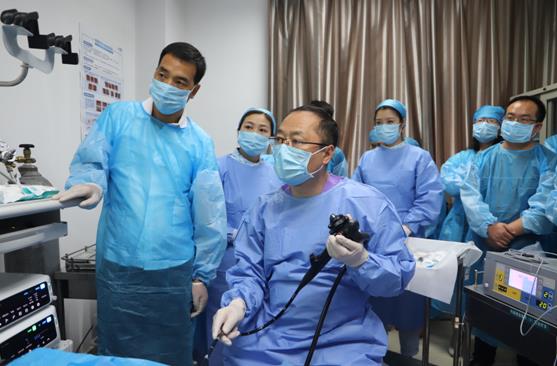 会后,在医院内镜中心,上海长海医院王东教授和西安交通大学第二附属医院邹百仓教授进行了消化道早癌筛查及治疗操作示教。指导大家如何发现消化道早癌,规范内镜早癌筛查流程,提高早癌检出率;并分别现场手把手培训了食管及胃早癌ESD(内镜下黏膜剥离)术。
