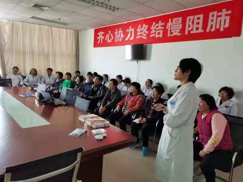 10:40分,科室又针对住院患者、既往住院老病友及其家属在住院部九楼示教室开展了“齐心协力终结慢阻肺”的宣传讲座。会上,贺娟梅、赵静、韩蓓医师为患者做了《慢阻肺稳定期管理》、《肺功能在慢阻肺中的应用》、《吸烟与慢阻肺》相关知识讲座,徐雯护师现场指导吸入装置的应用,针对患者的疑问医护们都给予了详细的作答。活动最后,由南晨护师带领全体人员做起了呼吸操,指导大家进行肺康复功能锻炼,整个活动现场气氛温馨活跃,得到了患者的认同和赞扬。