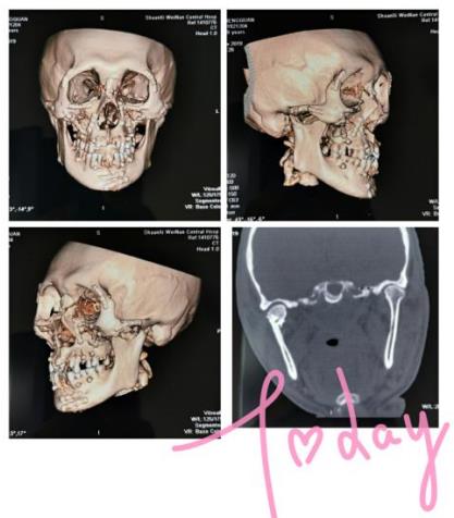 口腔科李瑞春主任带领团队组织多次的疑难病例讨论和术前讨论,术前通过面部CT分析全面部骨折的部位和移位程度,确定了手术切口方式、骨折复位的顺序及固定方式,以便精确地实施手术。采访中,李瑞春主任说:“手术的难度在于没有患者之前的样貌对比,需要根据解剖关系先复位下颌骨,对比下颌骨的位置复位上颌骨,然后复位颧骨、颧弓、眶下缘和鼻眶额区,术中探查时还发现眼底壁有组织缺损,眼球下坠,最后用人工材料替代了眶底壁,支撑起眼球,使眼球恢复至正常位置。”
