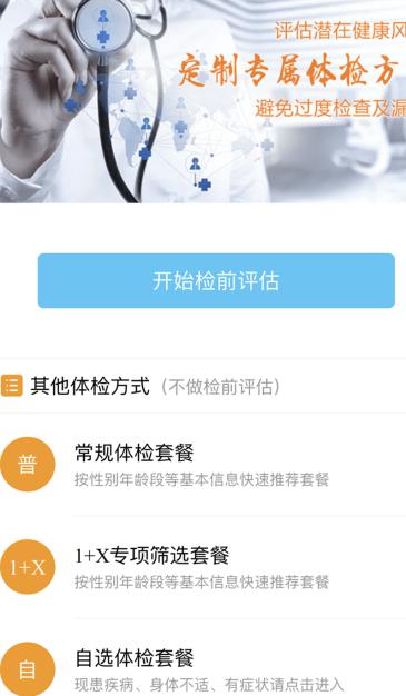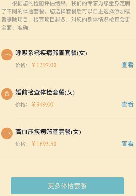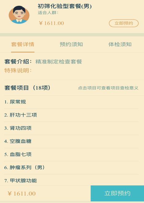 2、在体检助手”界面中点击“预约体检”,可在常规套餐里选择适合自己的套餐,而且可以查看套餐详情、体检项目;
