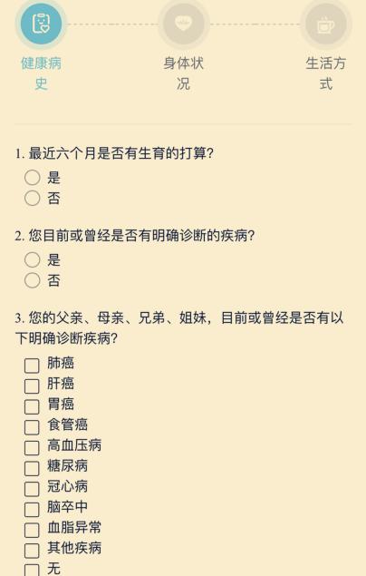 如果不想选套餐,也可以填写“检前问卷调查,”系统会根据你的健康史、家族史、既往史等进行评估,为你量身定制个体化体检套餐;