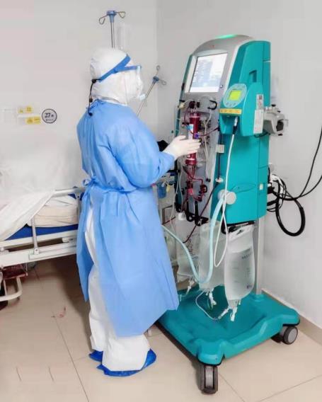 因为身穿防护服,她们不吃不喝不上洗手间,坚守在透析机旁,时刻巡视监测患者的生命体征,跨膜压、静脉压、血流量的变化,直至患者转危为安,安全下机。