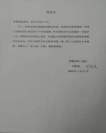 作为一名年轻护士,我想要奉献自己的一份力量,想留下来投入这场战“疫”与我的同事们并肩作战。于是,我主动向护士长表达了自己的想法,毫不犹豫地写下了请战书。我知道,对我来说,这是一次考验,但这更是我使命所在。纠结着打电话告诉父母我要去支援感染科,本以为他们会反对,会叨叨,没想到却得到全家统一支持,说我是他们的骄傲。