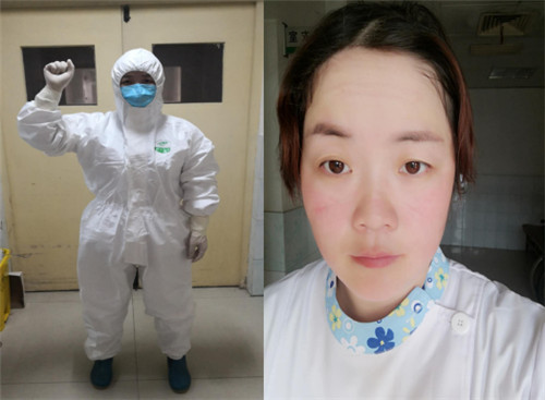 2月11日,我全副武装,作为第三批支援感染科的一员,对我来说是一个难忘的日子,第一次进入了新冠肺炎确诊区。病房有12名患者,新收了2名,给病人介绍病区环境和注意事项后,我投入了紧张有序的工作中。电话铃、呼叫器,接二连三;雾化、发口服药、输液、协助病人留取标本,马不停蹄……来不及恐惧,来不及害怕,只剩下忙碌。直到为一位患者输液时,额头上的汗珠顺着护目镜的边缘滴落下来,掉进眼睛里,才知道自己早已是汗流浃背。差不多九个小时没吃没喝,没上厕所,脱下防护服装备,衣服已湿透、脸郏已压痕累累,手指已发白。此时此刻,我深切地感受到,这真的是一次中华民族生死存亡的战斗,而我,就是冲锋一线的一员,我为此感到骄傲。然而,一切的辛苦与努力,在听到病人说“你们医护人员真辛苦”,看到他们高兴地康复出院时,我觉得我所做的一切值得,我骄傲,我自豪!我找到了自己的价值。