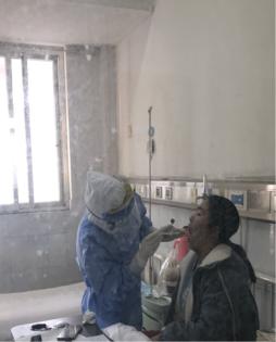 她的工作主要是每天为患者分发饭菜,打扫卫生、清洁、消毒;进入病房,采血、输液、吸氧、雾化……还要给病情需要的病人采取咽拭子,这个检查对诊断新冠肺炎有着重要的参考价值,也是一个异常高危的工作。