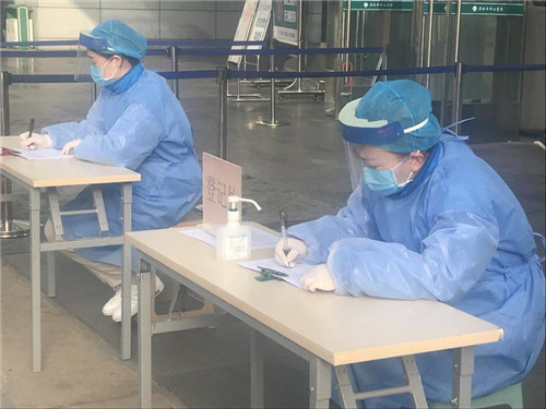 “您好,请这边来测体温!”“请问您今天就诊那个科室?”“您近期有没有发热、感冒流涕等症状?有没有去过外地?家里有没有人从外地回来?”这样的会话她们每天要反复说上百遍,并做好登记。