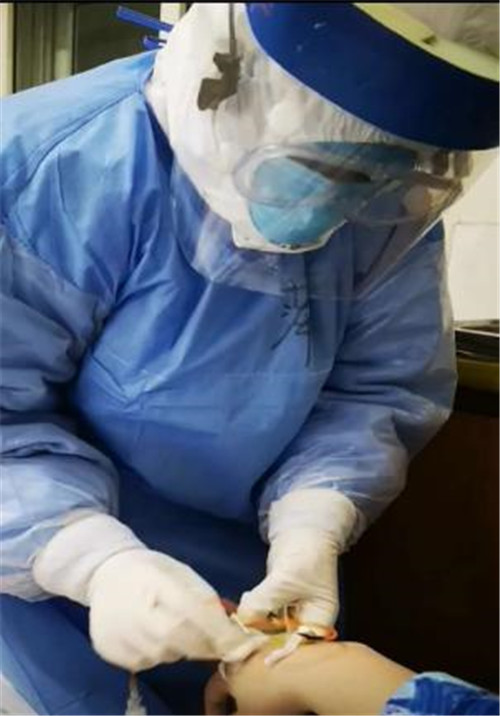 8小时里,不吃不喝不上卫生间就是她们工作的常态。交接班后穿戴好防护装备,并经同事检查合格后,开始了一天的工作。询问患者身体状况、打热水、采血、测血糖、送饭、输液、消毒、测生命体征、送药、陪病人做CT、协助医生治疗,往返于不同的病人之间。最困难的事就是带着护目镜、带双层手套给患者扎针,直接考验着她的技术水平,不过她都从容应对了,得到了患者的一致肯定。