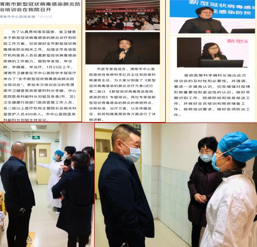 1月23日上午9时,医务科兵分两路,一路人员在学术报告厅组织召开“渭南市新型冠状病毒肺炎防治培训会”,全市医疗机构主管院长及相关科室医护人员400余人参加培训,刘韬科长主持会议。与此同时,一路人员焦建雄副院长带领下,检查发热门诊和隔离病房设置情况。