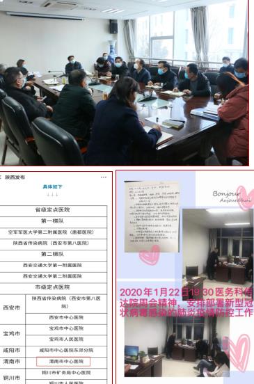 1月22日21:30分,接到急诊科电话,收治第一例由武汉返渭的发热患者。刘韬科长和李苗第一时间赶到,立即将患者安置发热门诊留观室,启动新冠肺炎医疗救治专家组、防控小组召开紧急会议,研判患者病情至凌晨、紧急协调疾控部门进行核酸检测,将患者收治隔离病房。