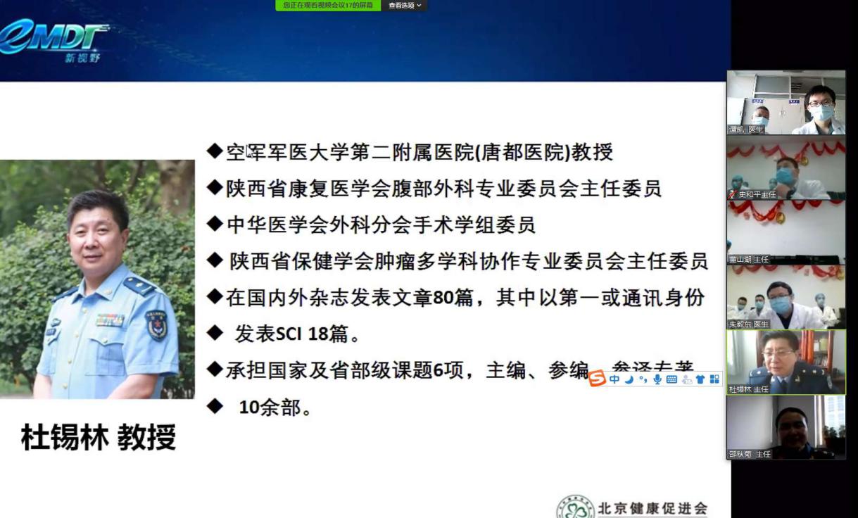 此次网络会议由陕西省保健学会肿瘤多学科协作诊疗专业委员会主委、空军军医大学唐都医院普外科杜锡林主任主持。空军军医大学唐都医院放疗科邵秋菊主任、空军军医大学唐都医院普外科谭凯教授、河南省人民医院肿瘤内科胡金龙主任以及我院MDT团队介入科李建国主任、放疗科黄丽萍主任、肿瘤内科姜西玲主任、超声科华玺主治医师以及普外科董山潮、史和平主任,朱毅东、吴云龙主治医师等参与线上线下讨论。