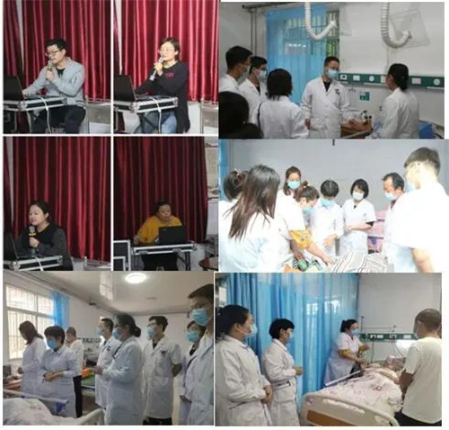 随后,问军锋医师带领科室青年骨干张强医师等人,进入危重患者病房进行常见操作指导及疑难问题处理。对病房患者目前存在的呼吸道、营养状况、用药及伤口的换药等方面的疑难问题进行一一解答;护士长徐萍带领护理团队优秀工作者赵苗、陈静等人,对一例气管切开患者进行吸痰、胃管的固定、切开处伤口的消毒、换药等关键环节进行了详细讲解、指导及现场演示。康复专科护士陈明红为大家详细介绍了偏瘫患者如何进行早期康复及体位变化时的规范要求。