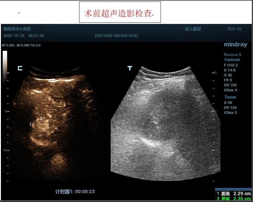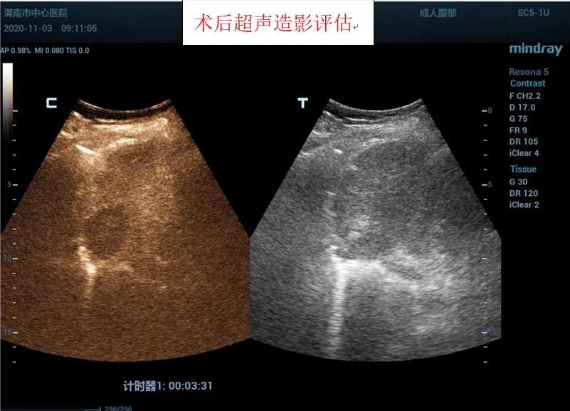 在王建宏教授的指导下,华玺副主任医师、韩婷婷主治医师的默契配合下,经过20余分钟,手术顺利完成,术后安返病房。术后3天超声造影进行评估,显示消融处呈无增强,提示达到预期治疗效果且患者精神状态良好。
