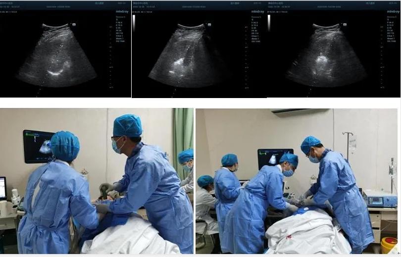 患者肿瘤较小且位置较深,紧贴膈肌,且患者伴有冠心病、糖尿病等基础性疾病,感染科李红兵主任在充分评估患者状况后,与超声科刘晓晖主任进行细致讨论,决定对患者行超声引导下微波消融术,因病灶位置特殊,为减少手术风险,特邀西京医院王建宏教授前来进行指导,借助超声造影对肿瘤的部位和血供进行评估和确认后,华玺副主任医师在超声引导下穿刺取活检(病理结果为肝细胞癌)、布针、将消融针娴熟准确地刺入肿块,对肿块进行灭活治疗。