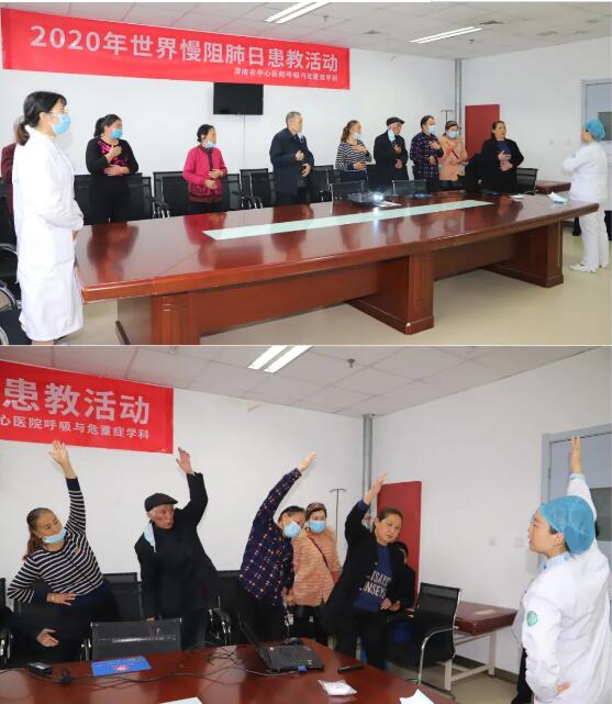 10时,医护人员针对住院患者、既往住院老病友及其家属在住院部九楼示教室开展了宣传讲座。会上,吕凌、张潇、贺娟梅副主任医师为患者做了《慢性阻塞性肺疾病如何早发现》《慢性阻塞性肺疾病如何长期管理》《如何预防慢性阻塞性肺疾病急性发作 》相关知识讲座。马珍护师对《呼吸装置、峰流速仪的应用》做了简单通俗讲解。针对患者的疑问,医护人员给予了详细解答。张晓翠护师带领全体人员做起了《呼吸操》,指导大家进行肺康复功能锻炼,整个活动现场气氛温馨活跃,得到了患者认同和赞扬。